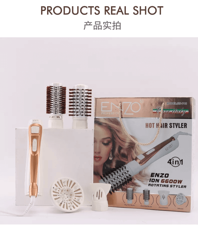 سشوار چرخشی انزو مدل Enzo En-748 محصول جدید برند Enzo می باشد که نیاز سالن کاران و آرایشگران، همچنین بانوان را در داخل خانه برای داشتن یک سشوار که در عین خشک کردن موها به آن ها نیز حالت دهد، رفع خواهد کرد. به وسیله ی سشوار چرخشی 748 انزو شما می توانید درحالی که موهایتان را سشوار می کنید به آن ها حالت دهید. این سشوار چرخشی دارای ۴ سری مختلف است که دوتای آن ها برس های چرخشی و دوتای دیگر جهت استفاده از دستگاه به صورت سشوار عادی استفاده می شود که یکی متمرکز کننده هوا و دیگری پخش کننده می باشد. پس با داشتن این وسیله هم سشوار خود را دارید و هم هنگام سشوار کردن می توانید موهای خود را حالت دهید.